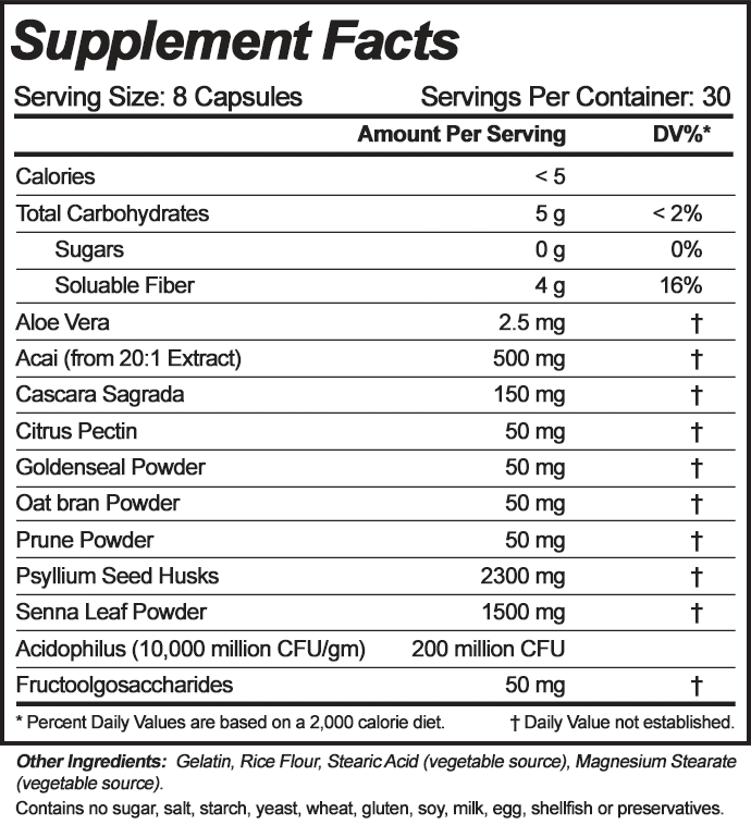 - High fiber colon formula with 500mg Acai and other nutrients.